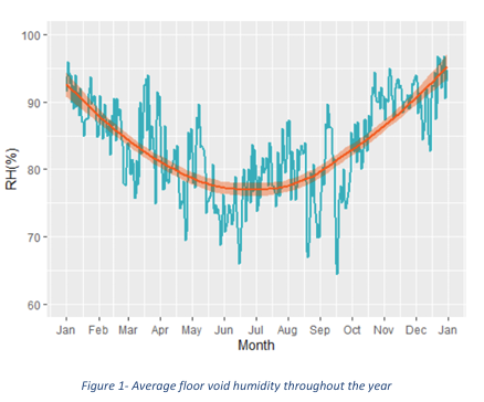 The study first confirmed that underfloor humidity closely follows seasonal weather patterns, with relative humidity at its lowest in summer and highest during the cooler months. As the report notes: